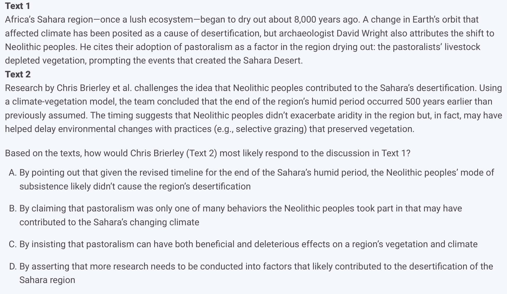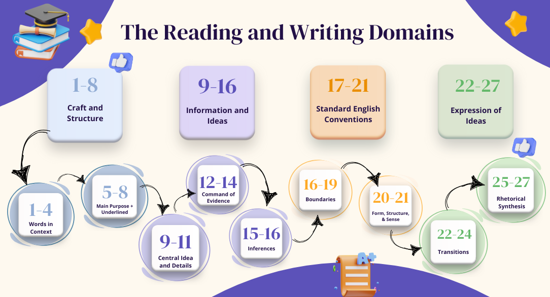 If you're the type of person who can get distracted with longer reading passages or who might suffer from cognitive fatigue, starting from the reading comprehension passages like Main Purpose, Central Ideas and Details, or Command of Evidence might be your best approach. These skills begin around questions 4-8, generally. This is the approach that works best for me, but I typically save it for the second module.