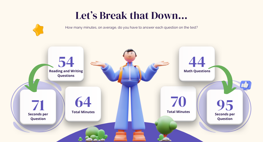Much of the test should stay the same. The digital SAT still consists of two main sections: Reading and Writing and Math. You’ll have a mix of multiple-choice questions and write-in responses, with topics ranging from Algebra to Words in Context vocabulary-style questions. Additionally, there’s no guessing penalty, so answer every question!