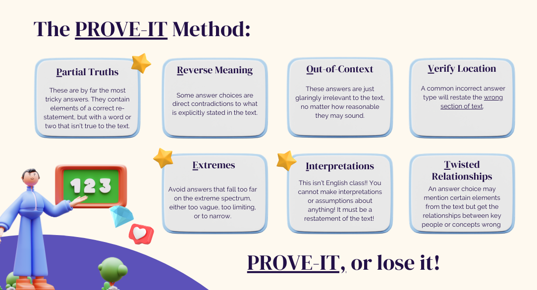 The “V” in PROVE-IT stands for “Verify the location.” It is a reminder that even though an answer choice may contain a 100% true statement about the text, it doesn’t target the area of the text we need for the prompt. Here's a real College Board SAT question that uses this pattern: