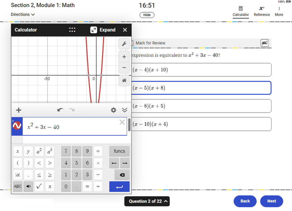 The Math section includes both multiple-choice and student-produced response (grid-in) questions. A built-in Desmos calculator is available throughout the entire Math section, or you can bring your own approved calculator.